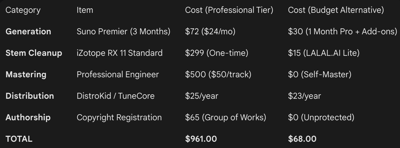 In January 2026, the barrier to entry is lower than ever, but the cost of "professionalism" is fixed. Here is the honest breakdown of what it actually costs to produce a high-fidelity, 10-track album using the Suno v5 ecosystem.