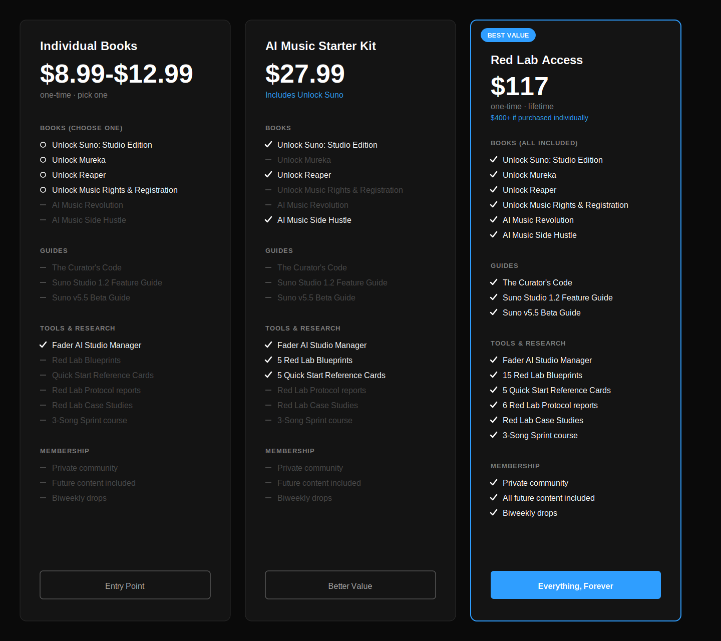 Every piece of content inside Red Lab Access was built for the same workflow. Every book connects to every guide. Every research report tests what the books teach. Every Blueprint applies the research. Every case study documents it in action. Fader operationalizes the entire system in real time. The 3-Song Sprint puts it into practice with a finished body of work at the end.